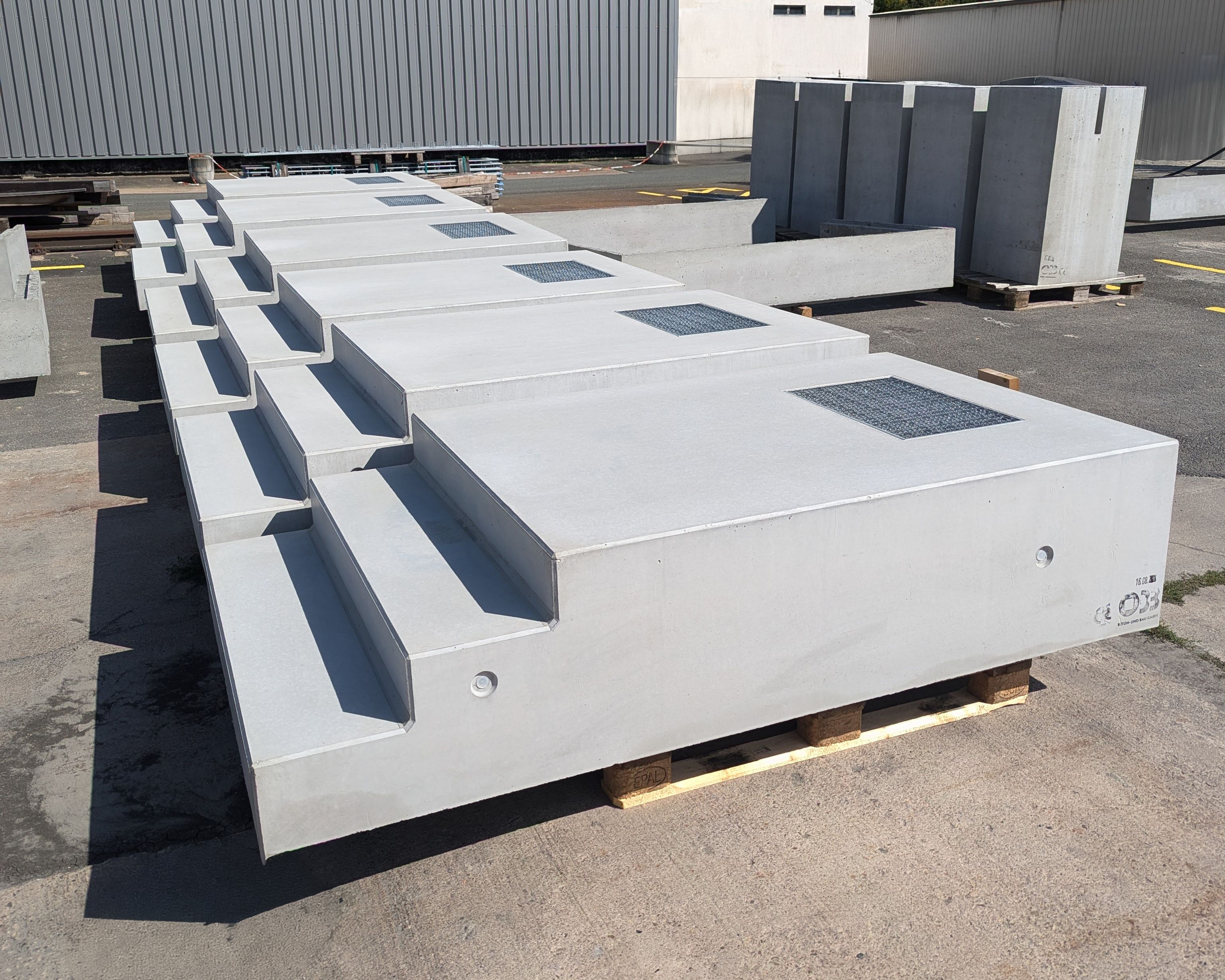Unsere Eingangspodeste werden aus Beton der Klasse C30/37 (XC4, XF1) gefertigt und verfügen über eine rutschfeste Oberfläche (R11), die auch bei widrigen Wetterbedingungen optimalen Halt bietet. Auf Wunsch kann eine unterseitige Aussparung zur Gewichtsreduzierung integriert werden. Sichtbare Kanten sind gefast, um sowohl die Sicherheit als auch die Optik zu verbessern.